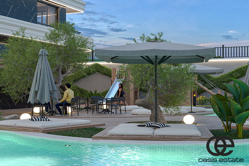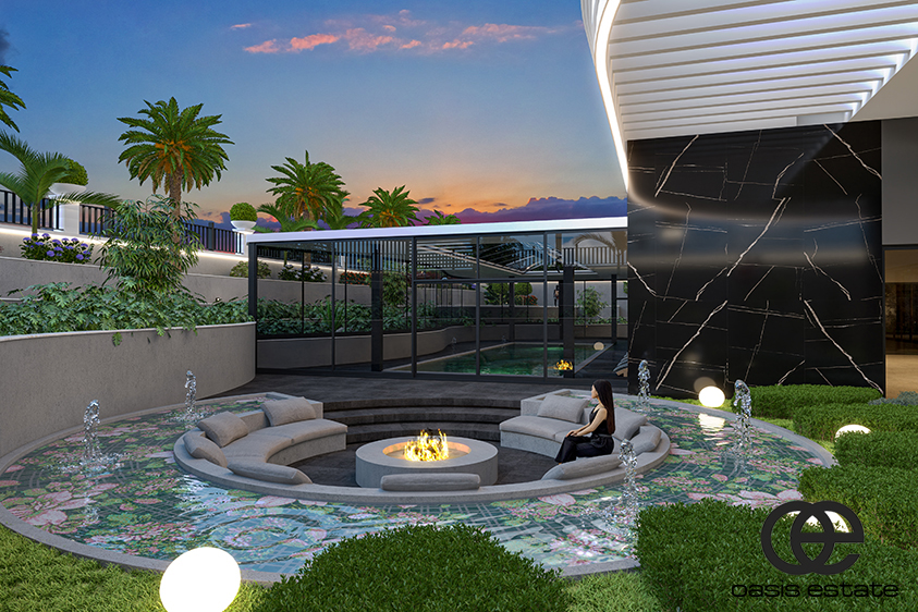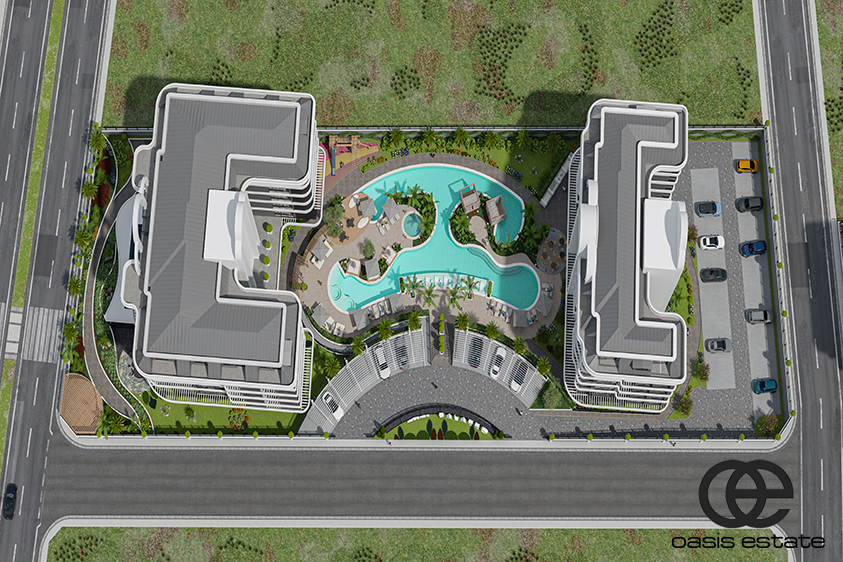The complex consists of two apartment blocks located on a plot of 7000 square meters. The currently empty plot on the south side of the complex is designated as green park area which will be delivered soon by the Alanya municipality.