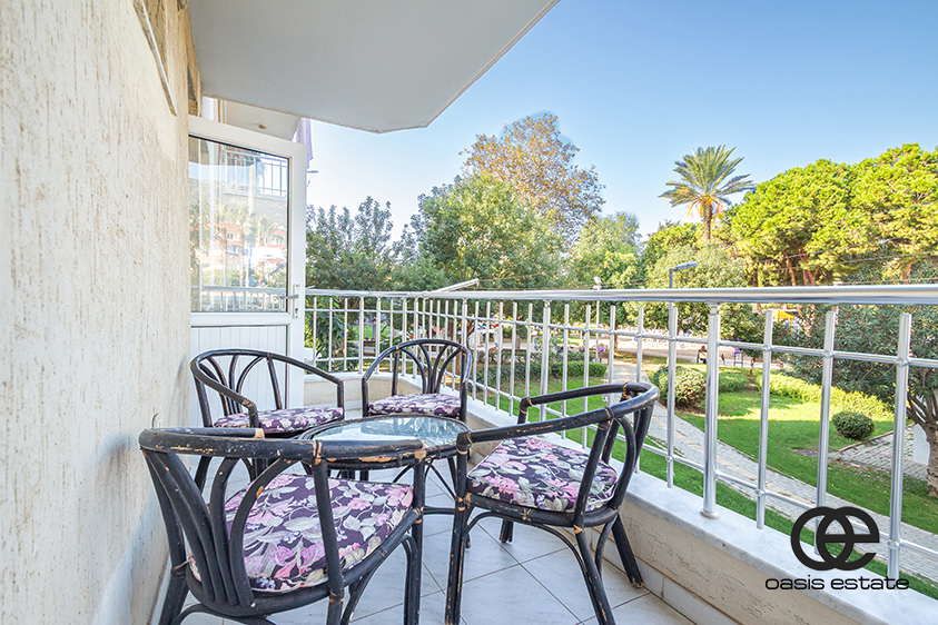 One balcony overlooks a park and green area, providing an open and pleasant outlook. The second balcony faces the pool, with a side view of the sea. The complex includes maintained gardens, creating a calm and inviting environment.