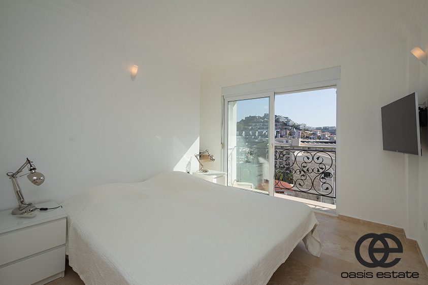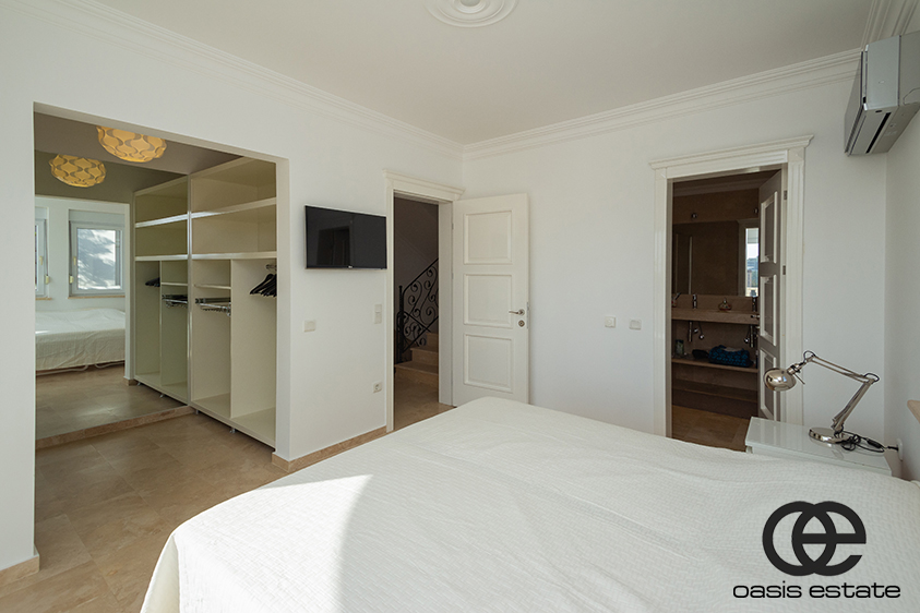 Step inside the villa to discover two generously proportioned living areas spread across different floors, each leading out to its own balcony, which offers stunning views of the sea and majestic mountains. The open-space, modern kitchen is fitted with top-quality stainless steel appliances and premium materials that ooze luxury.