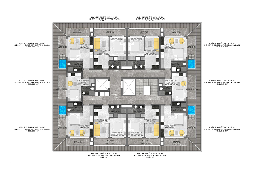 This modern complex arises in the very heart of Alanya city. The complex offers everything to create a pleasant stay wrether it's long or short term.The entire project consists of 1+1 apartments with all modern facilities and interior design of highest quality.
