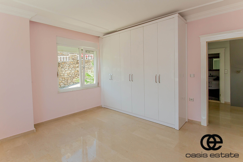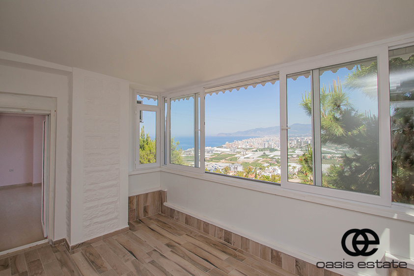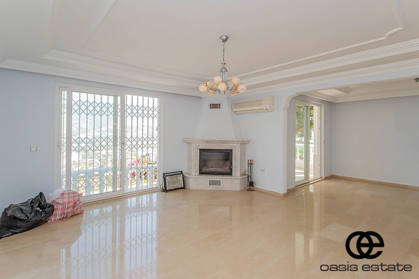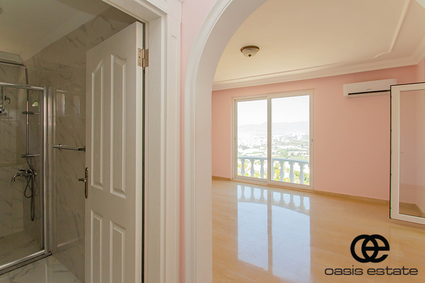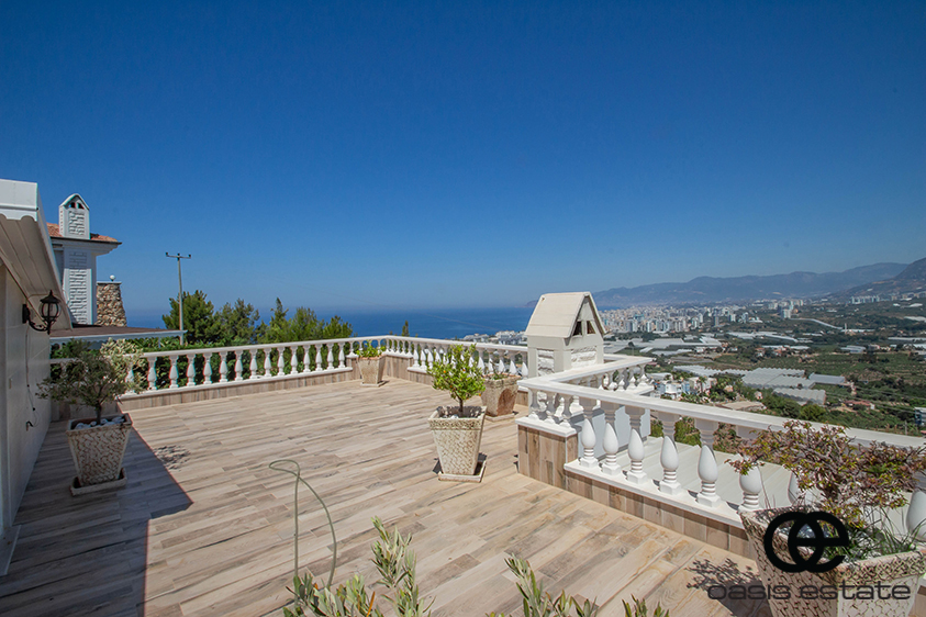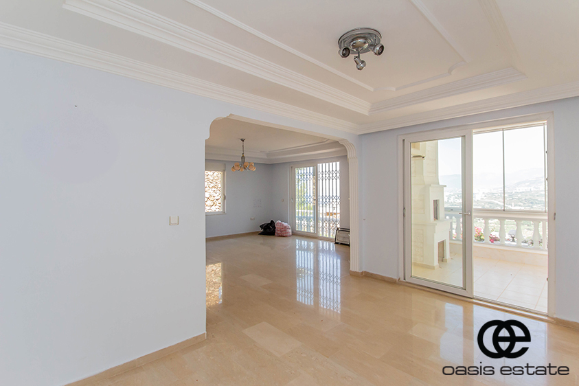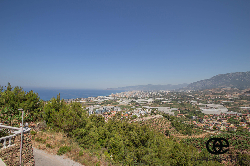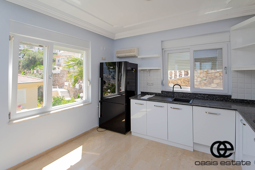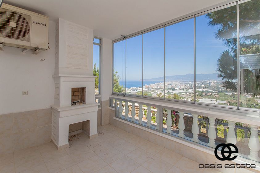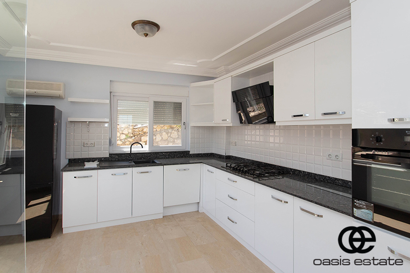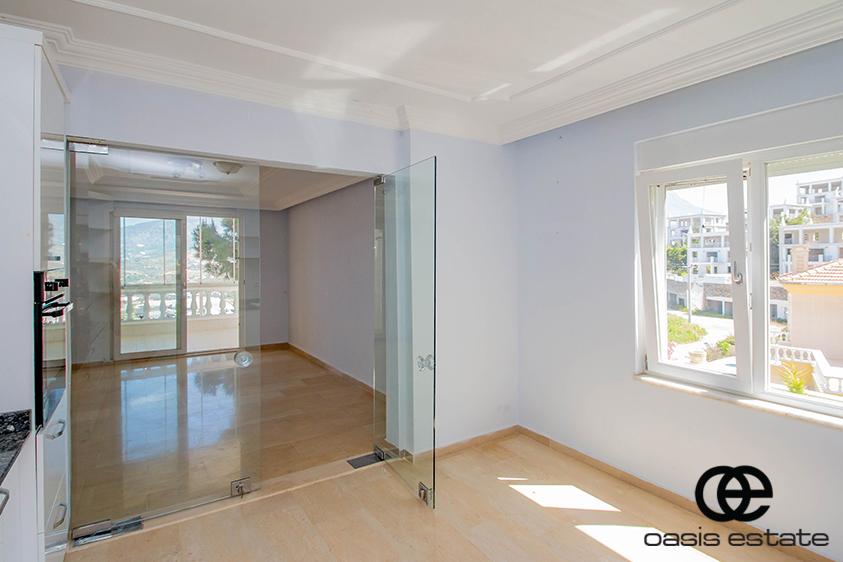 Cozy villa with 3 bedrooms and extra-ordinary interior facilities such as super modern kitchen with glass doors, well-appointed bathrooms and 2 winter gardens with glass part and views of Alanya and the Mediterranean. Garden with space for construction of own private pool.