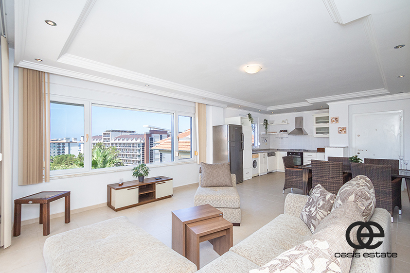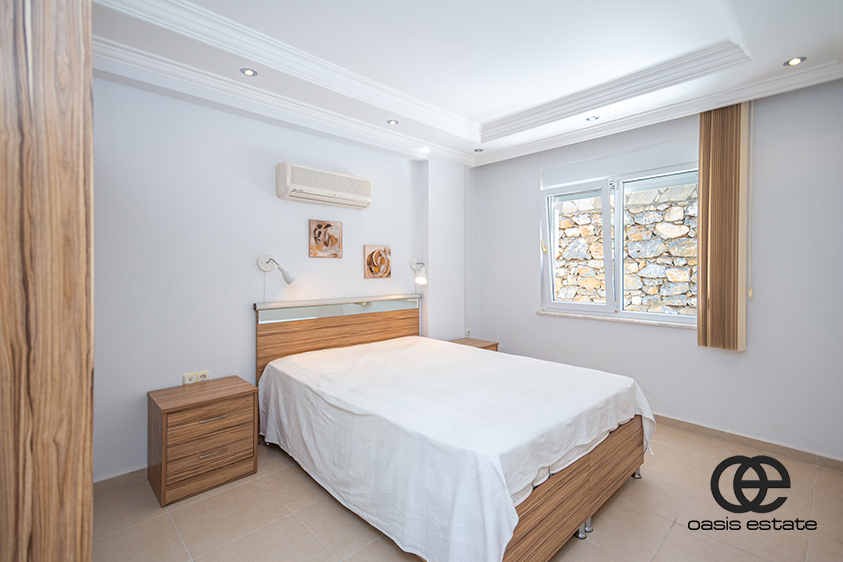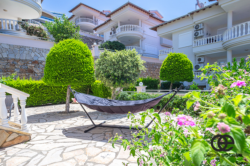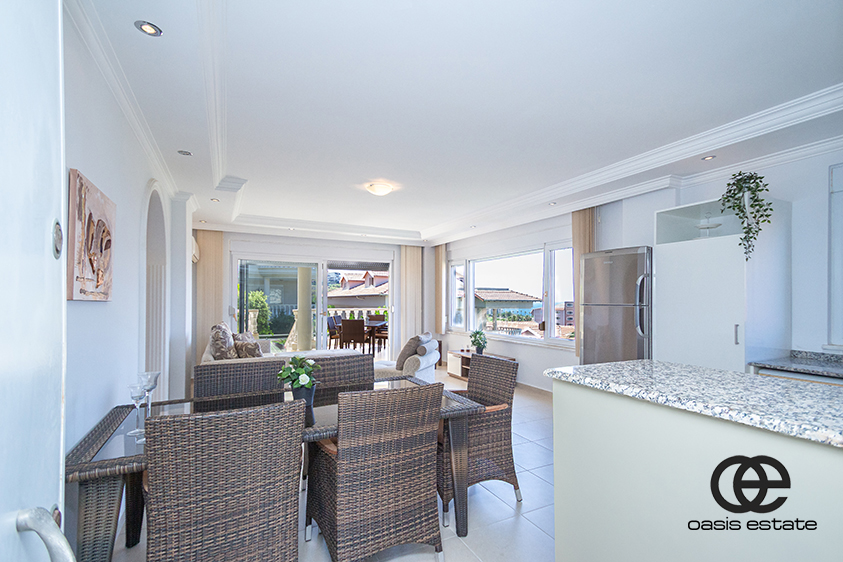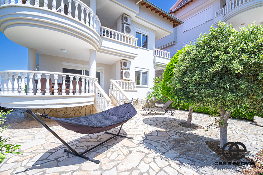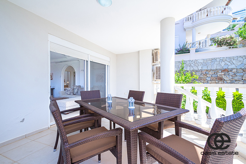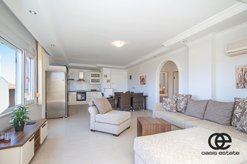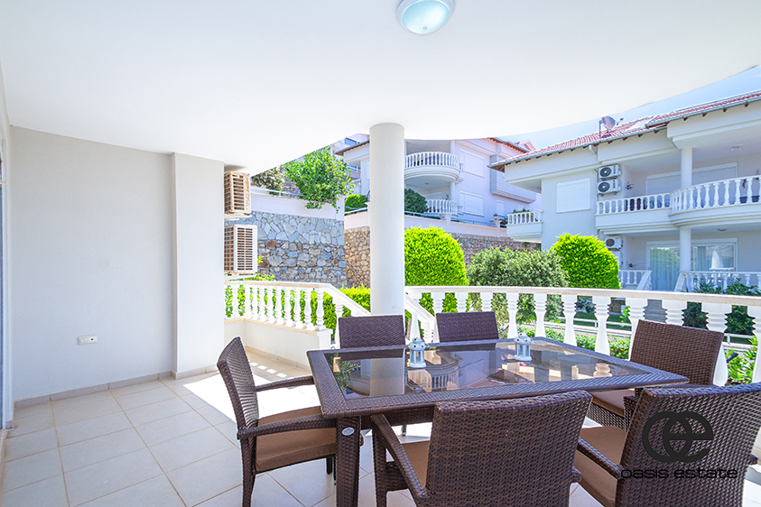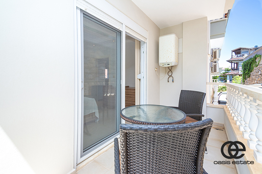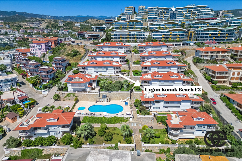 Located in the well-maintained Uygun Konak Beach residential complex, this 2-bedroom garden apartment offers a comfortable and practical living space just a short walk from the beach in Konaklı, Alanya.