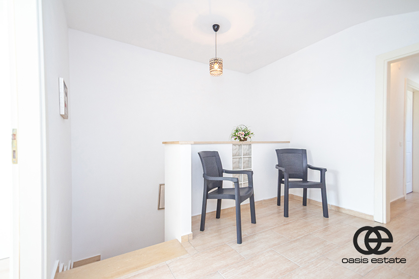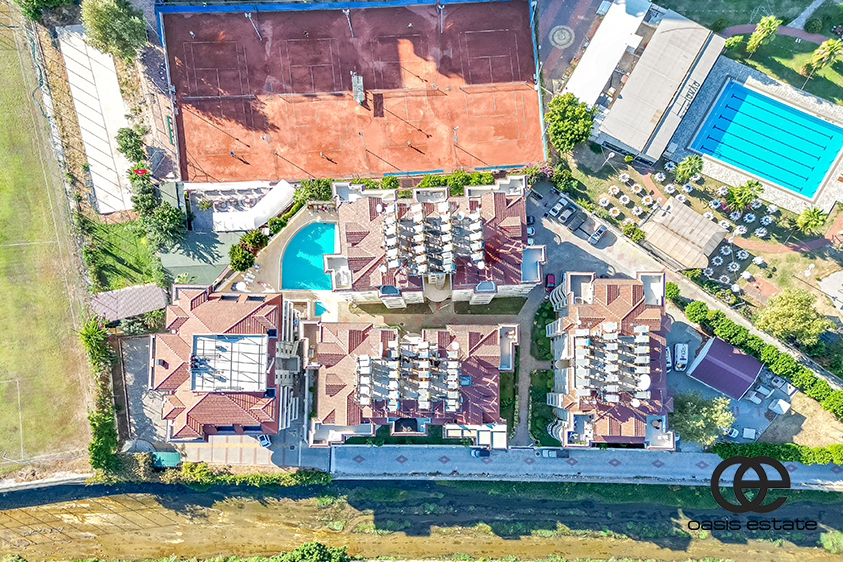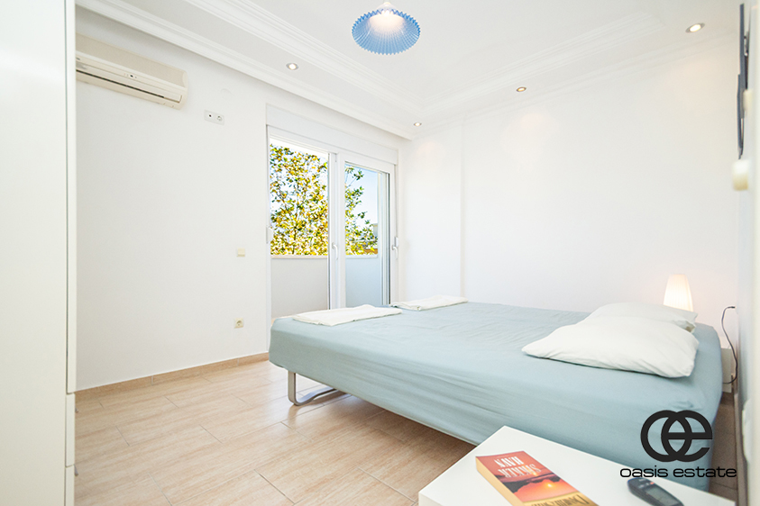 The complex offers a parking lot, an outdoor swimming pool, and beautifully kept gardens. A river runs right next to the property, adding to the calm atmosphere, while the apartment itself provides stunning sea views, mountain views, and overlooks the nearby football field. It is both peaceful and centrally located.